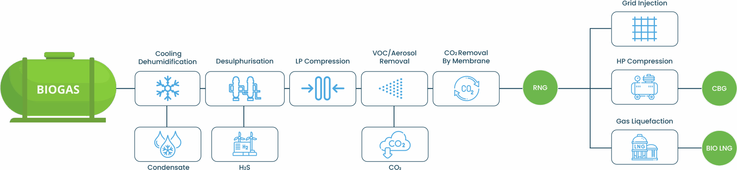 Raw biogas from the digester undergoes initial treatment to remove moisture and hydrogen sulphide preventing corrosion and ensuring downstream equipment protection.