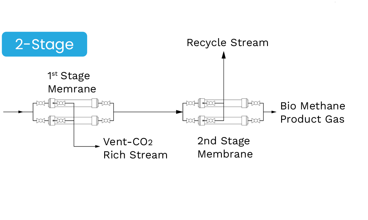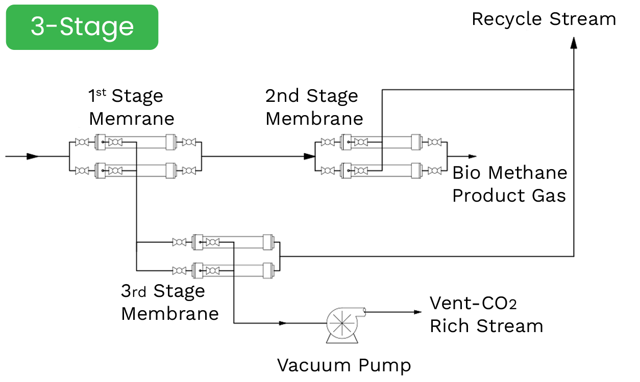 A two stage membrane based biogas upgradation can offer a methane recovery of >97%, however a three stage membrane based biogas upgradation can offer a higher recovery of >99%.